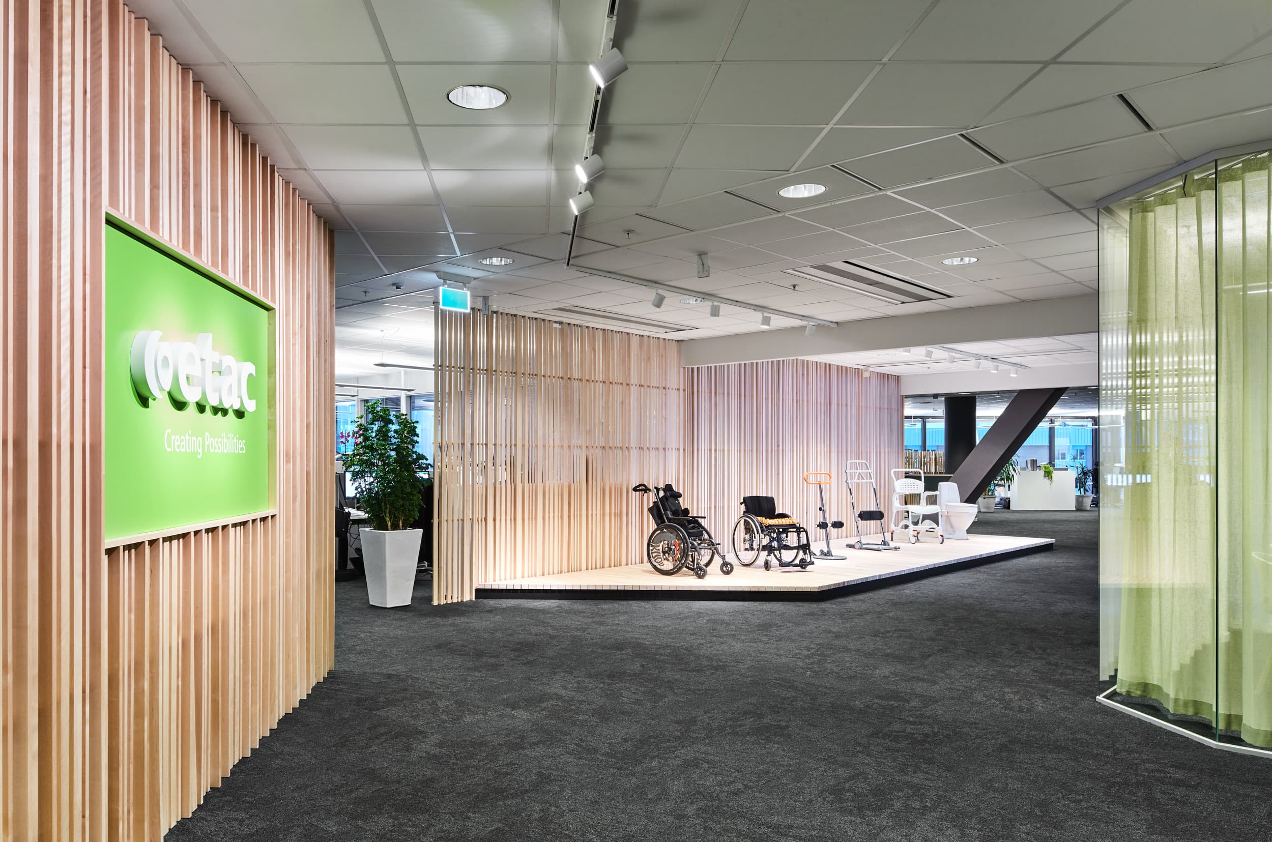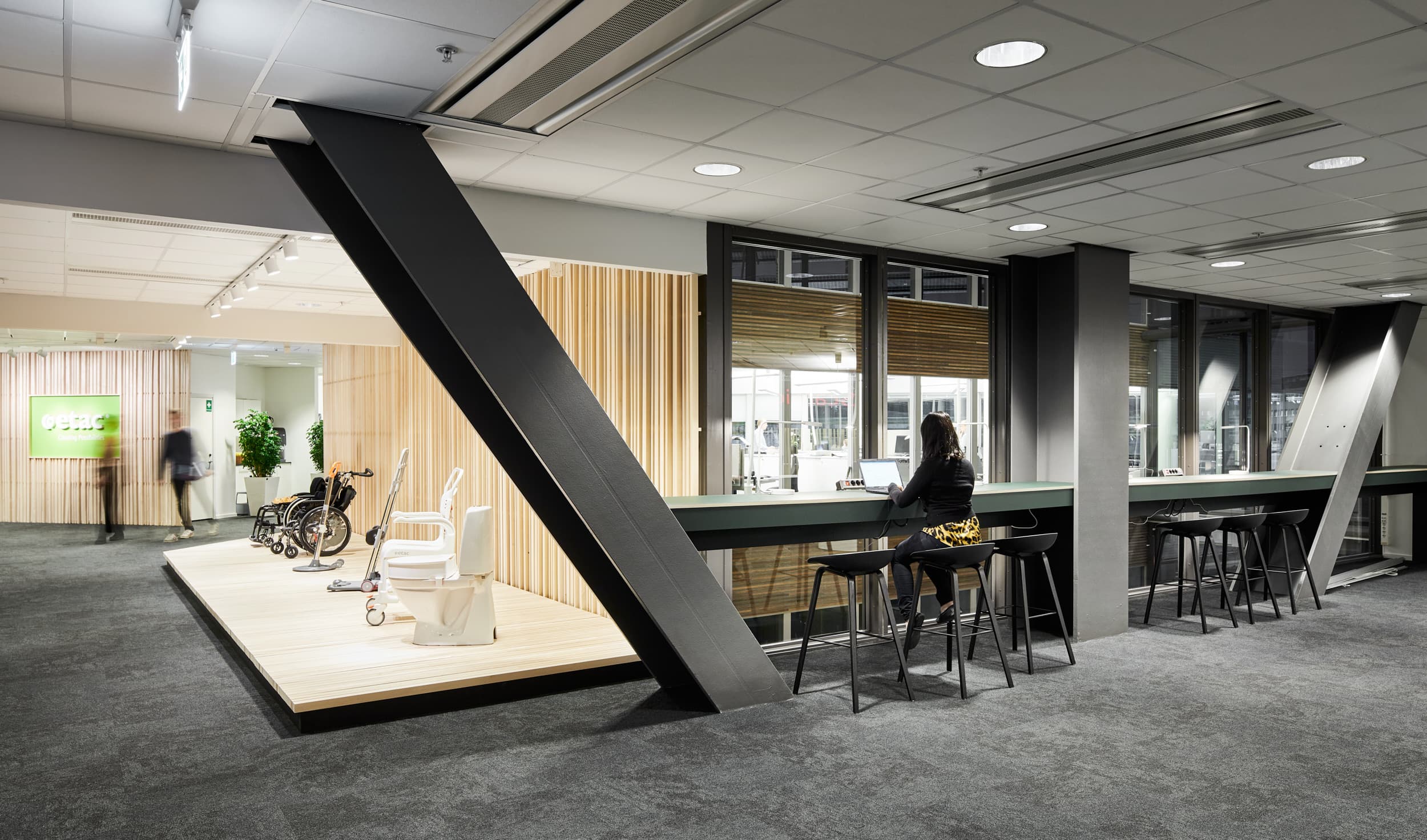 We created a new office for Etac, an award-winning producer of mobility and rehab products. The main feature is a timber display structure, putting Scandinavian design and natural materials to the forefront.