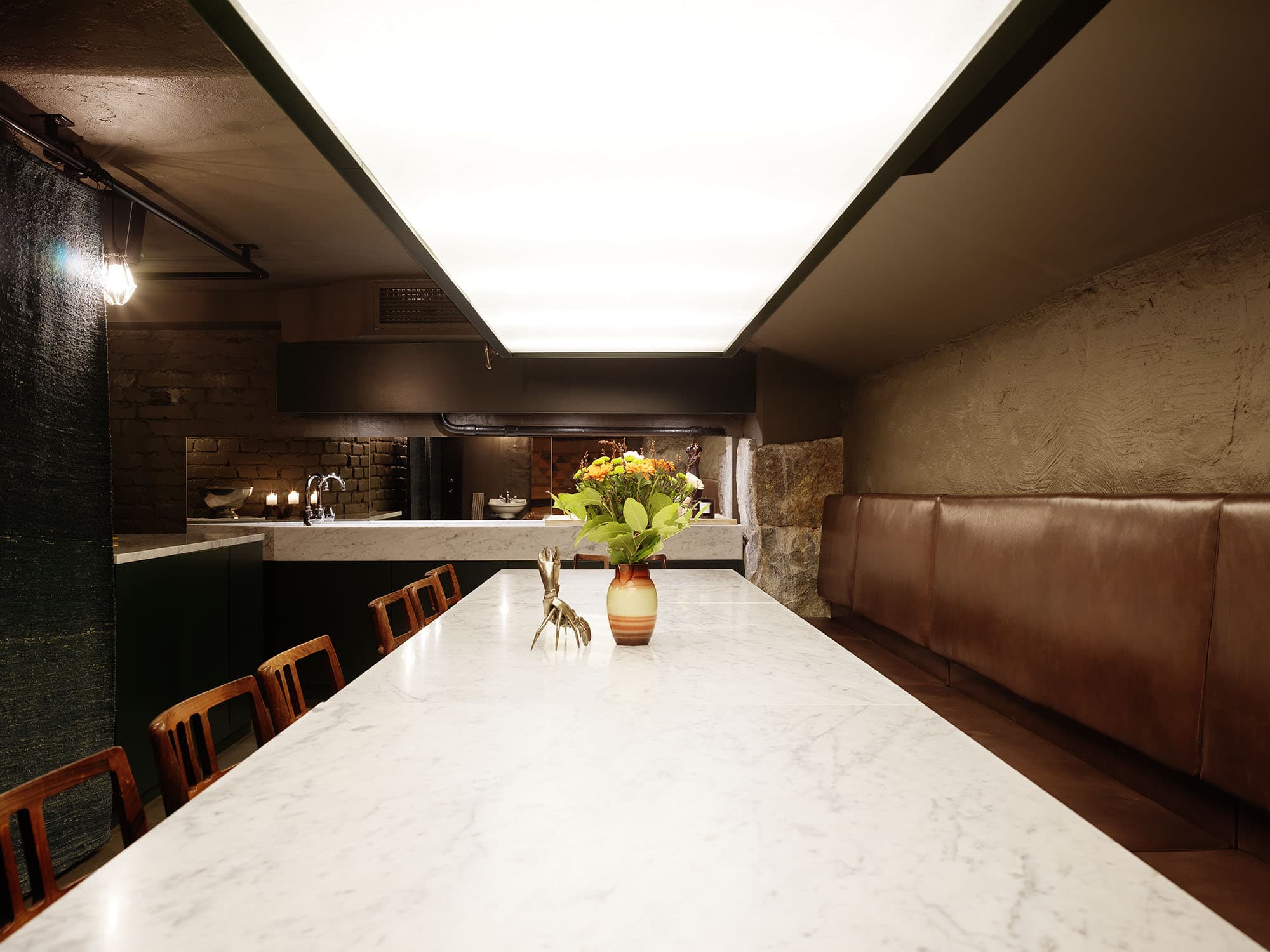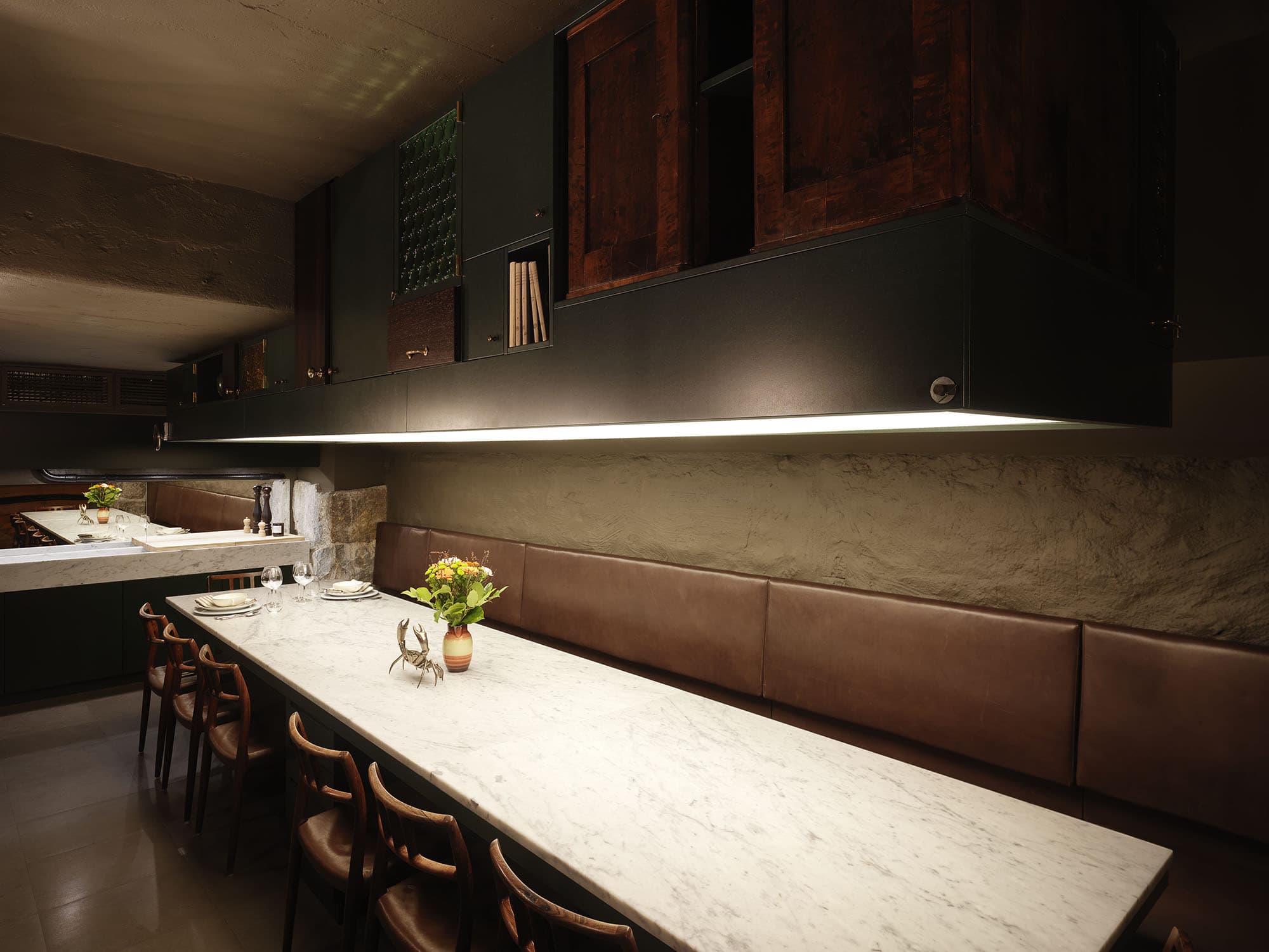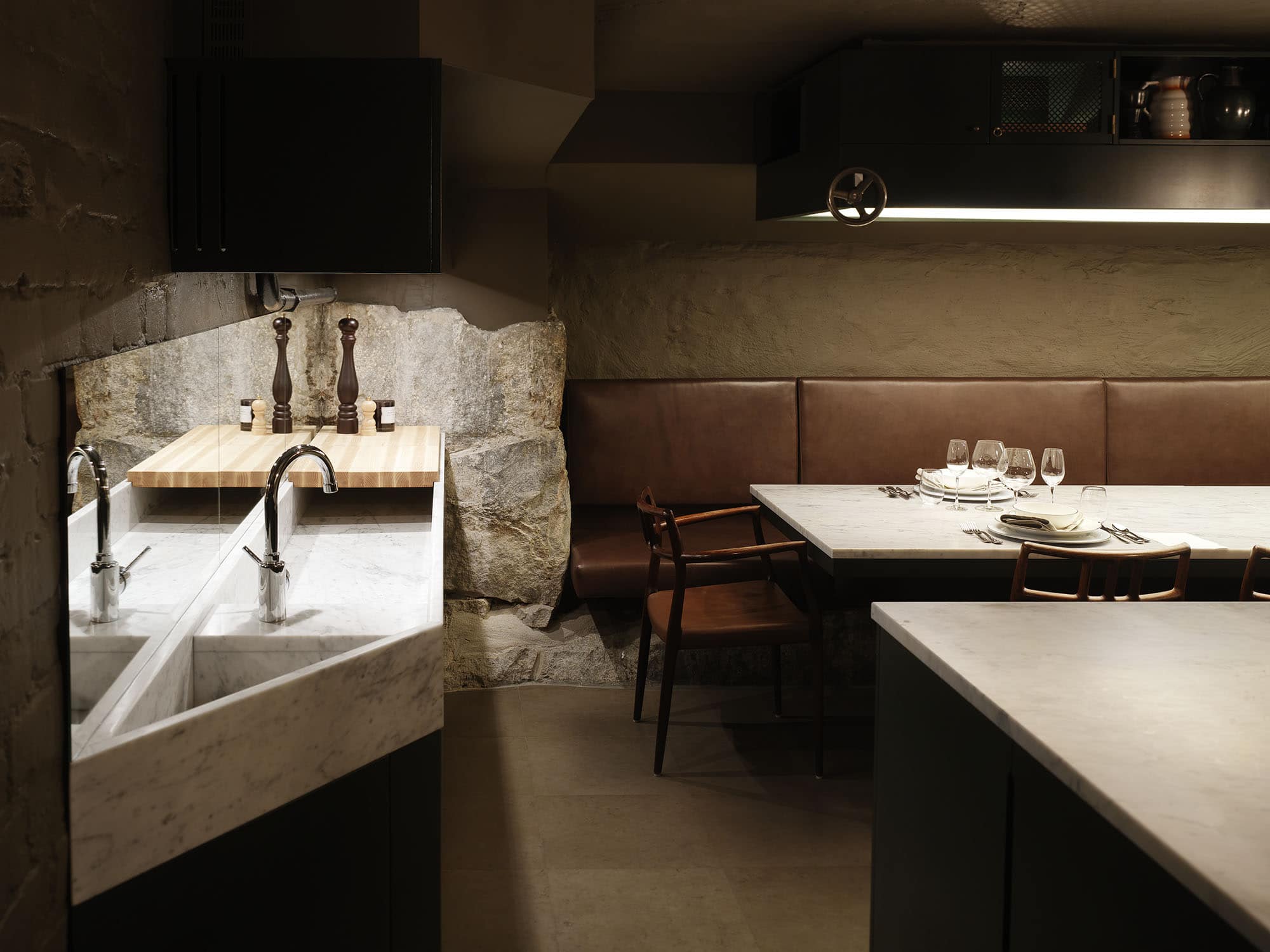 Dining area for the restaurant Mäster Anders, which has been situated in the same location since 1905. All furniture and fittings are custom-made or vintage, selected exclusively for the project.